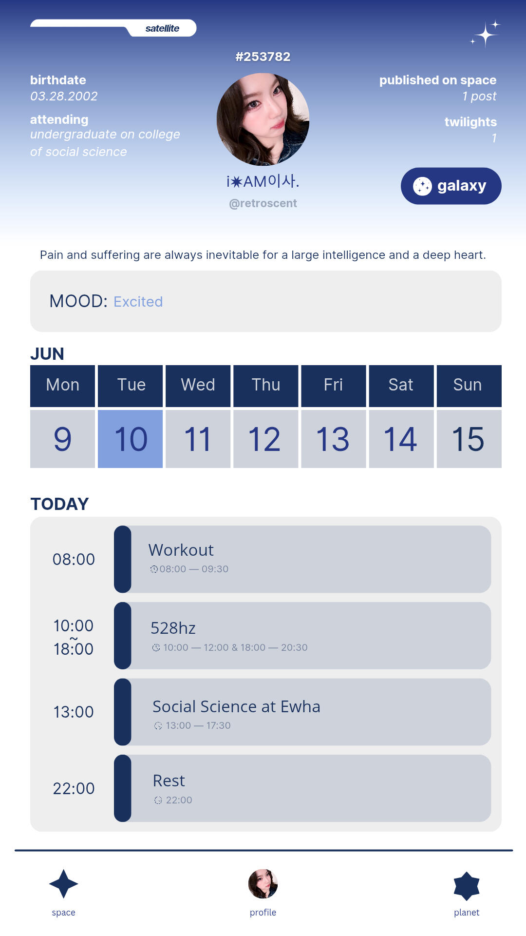 Nome: Moon "Acsa" Aisya (문아이사). Data de nascimento: 28/03/2002. Local de nascimento: Busan, Coréia do Sul. Reside atualmente: Seul, Coréia do Sul. Ocupação: Artista Independente, produtora, CEO do Blue Rising 528hz e graduanda em Ciências Sociais no Departamento de Sociologia na Universidade Feminina Ewha. Altura: 1,65m. Personalidade: ISFJ. 2w3. Fleumática dominante. Verdadeiro Neutro. EFLV. RCOAN. sx/sp. Idiomas: KR, PT-BR, ENG, JP. Sexualidade: Bissexual e monogâmica. Status: Indisponível. Mapa astrológico: Sol em Áries, Lua em Câncer e Ascendente em Escorpião. Apelidos: Sasa, Asa e Isa. Disfunções: CID 10 F84.1. ────────┈┈ Acessórios usuais: Óculos de grau ou lentes de contato, moletons, boinas e headphone. Sabor favorito: Melão e pêra. Aroma favorito: Floral-Frutado e Lavanda. Lugar favorito: Seu estúdio. Comida favorita: Tteokbokki de sua avó. Objeto favorito: Walkman com gravador de voz e guitarra elétrica.